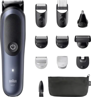 1 trimmer, 6 kammen, 3 opzetstukken, 1 reinigingsborstel, 1 etui