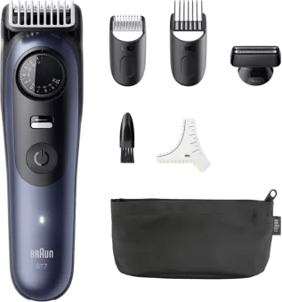 1 baardtrimmer, 2 kammen, 1 opzetstuk, 1 baardsjabloon, 1 oplaadstandaard, 1 etui, 1 reinigingsborstel