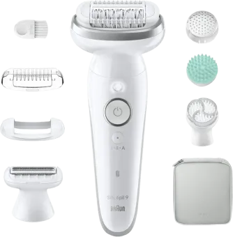 Braun epilator, scheerkop, trimkam, huidcontactopzetstuk, exfoliatieborstel met beschermkapje, massagepad, etui, reinigingsborsteltje, smartplug